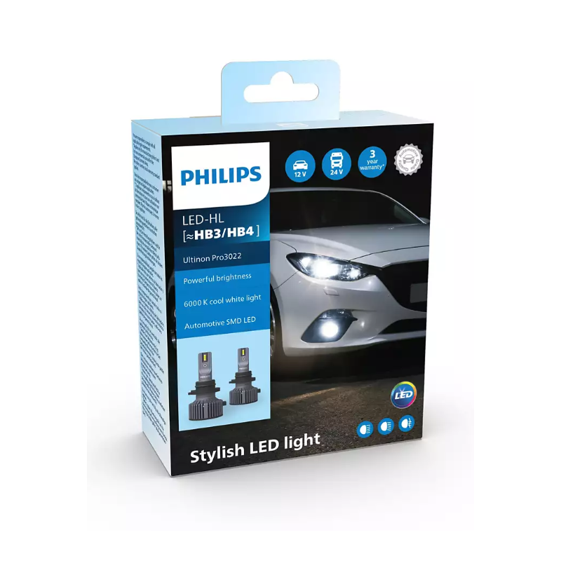 Automobilová žárovka LED Philips Ultinon Pro3022 zvyšuje viditelnost až o 100 %*. I když vás některé jiné žárovky LED mohly zklamat (obvykle proto, že v reálných podmínkách nedosahují slibovaného počtu lumenů neboli jasu), tato žárovka poskytuje solidní výkon a kvalitní světlo. Homogenní kužel světla vám umožní vidět zřetelněji bez oslnění ostatních účastníků silničního provozu a vysoká svítivost zajistí konzistentní světelný výstup na silnici před vozidlem. Kvalitní, dopředu směřující kužel světla vyžaduje, aby byly žárovky LED v jednotce světlometu správně umístěny. To znamená nevynechávat seřízení – věnujte mu čas a proveďte jej správně.