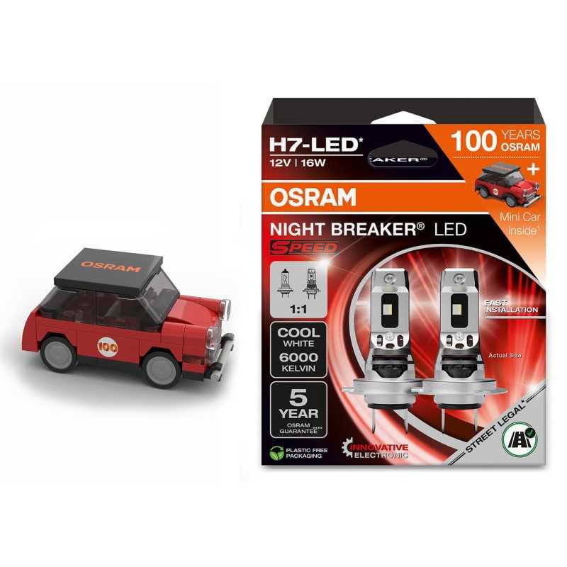 akční balení legálních LED žárovek H7 řady SPEED, které jsou připraveny ve speciálním jubilejním balení spolu s LEGO skládačkou mini autíčka OSRAM.