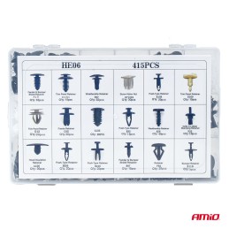 Profesionální sada 415 spon a montážních kolíků určená k opravě, servisu a údržbě karoserií automobilů. Obsahuje různé spony, klipsy a kolíky, které umožňují bezpečné upevnění karosářských panelů, lišt, plastových krytů a dalších prvků karoserie.