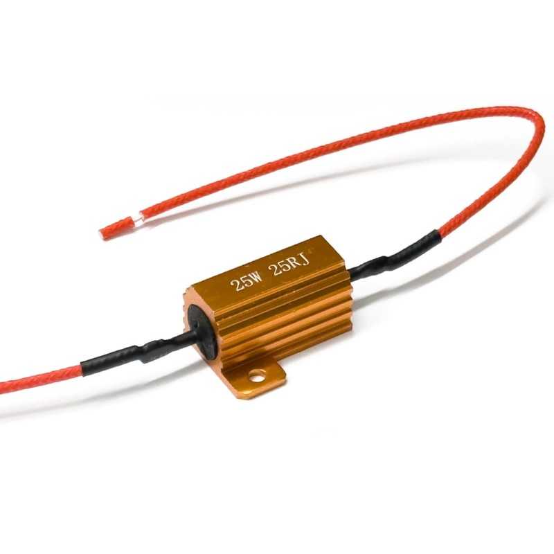 Výkonový rezistor pro LED žárovky do výkonu 12V/25W, slouží např. k eliminaci chybových hlášení a rychlého blikání směrových světel ve vozidlech při montáži LED žárovek. Některé moderní vozy mají funkci elektronické kontroly prasklé žárovky, což má za následek při výměně klasické žárovky za LED žárovku s nižším příkonem vznik chybového hlášení. Toto lze eliminovat paralelním připojením vhodného rezistoru k LED žárovce.