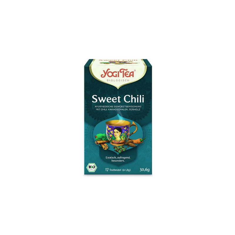 Yogi Tea Bio Sweet Chilli is an Ayurvedic herbal and spice blend with chilli, cacao nibs and licorice. Sweet, spicy, aromatic tea embraces the joy of life and brings positive energy .