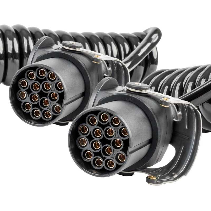 Profesionální spirálový kabel se dvěma 15 PIN konektory, určený pro 24V instalace. Poskytuje komplexní elektrické propojení mezi tahačem a návěsem – pro osvětlení, ABS/EBS systémy a další zařízení podle normy DIN ISO 12098.